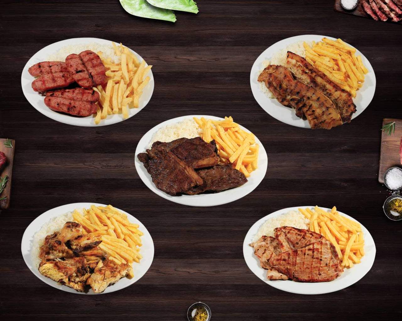 Menu com 2 picanhas (aprox. 180 g), 1 dose de batatas (aprox. 180 g), 1 dose de arroz (aprox. 200 g) e 1 bebida (33 cl) ou 1 cerveja (33 cl).
