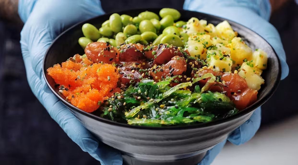Base de arroz com atum, salmão, abacate, pepino, cebola roxa, goma wakame e sésamo.