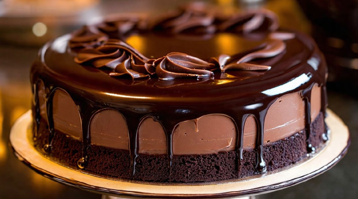 Massa úmida de chocolate recheada com creme de chocolate belga 60% e coberta com ganache de chocolate Belga.