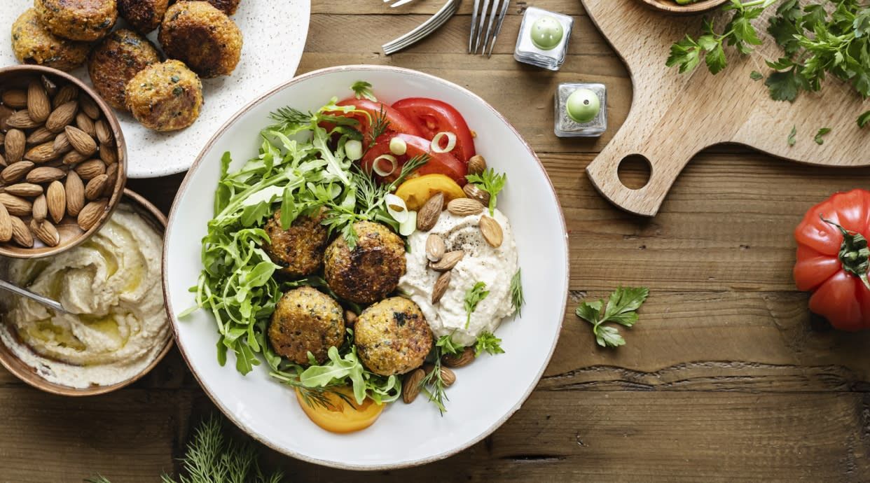 Abacate, milho, grão, tomate, frutos secos e azeite.