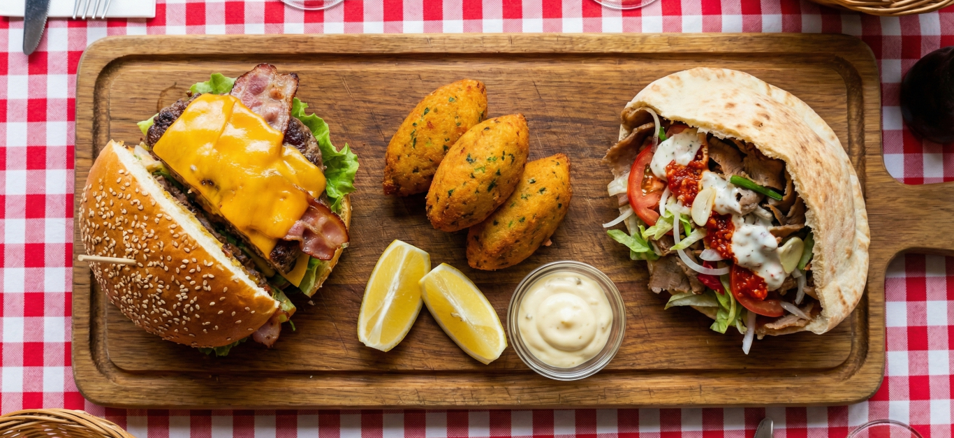 Fatias de carne assada temperada, tipicamente servidas em pão achatado com vegetais frescos e molho à escolha.