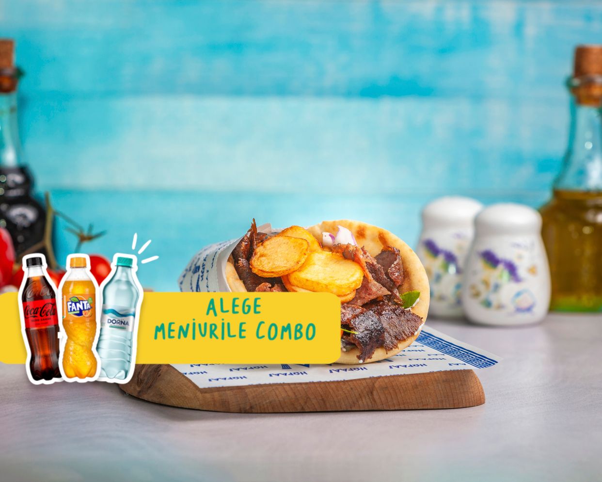 Pita greceasca, tzatziki, carne de pui si porc, cartofi prajiti, rosii, ceapa rosie, salata verde -350 gr