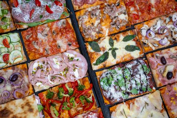 Pizza la felie cu blat roman 20x10cm. Ingrediente: sos de roșii, mozzarella fior di latte, pancetta, prosciutto cotto, salam Spianata Dulce - 150g