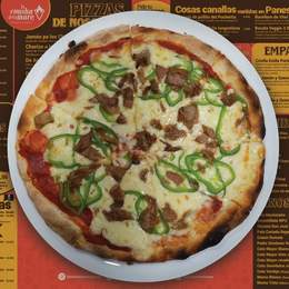 Salsa de tomate, mozzarella, chorizo criollo, cebolla y chimichurri