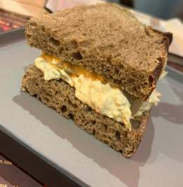 Sándwich de pan de malta tostada, con una ensalada de pollo muy flamenca