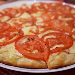 Salsa de tomate, mozzarella, tomate de Conil, ajo, AOVE y orégano