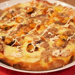 Salsa de tomate, mozzarella, atún Mamazo, mejillones Mamazo, gambas arroceras, anchoas y lactonesa de mariscos