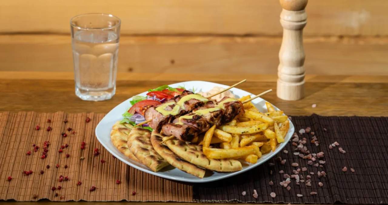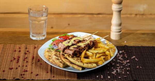 2 frigărui de porc, salată, roșii, ceapă roșie, tzatziki, cartofi, pita - 600g