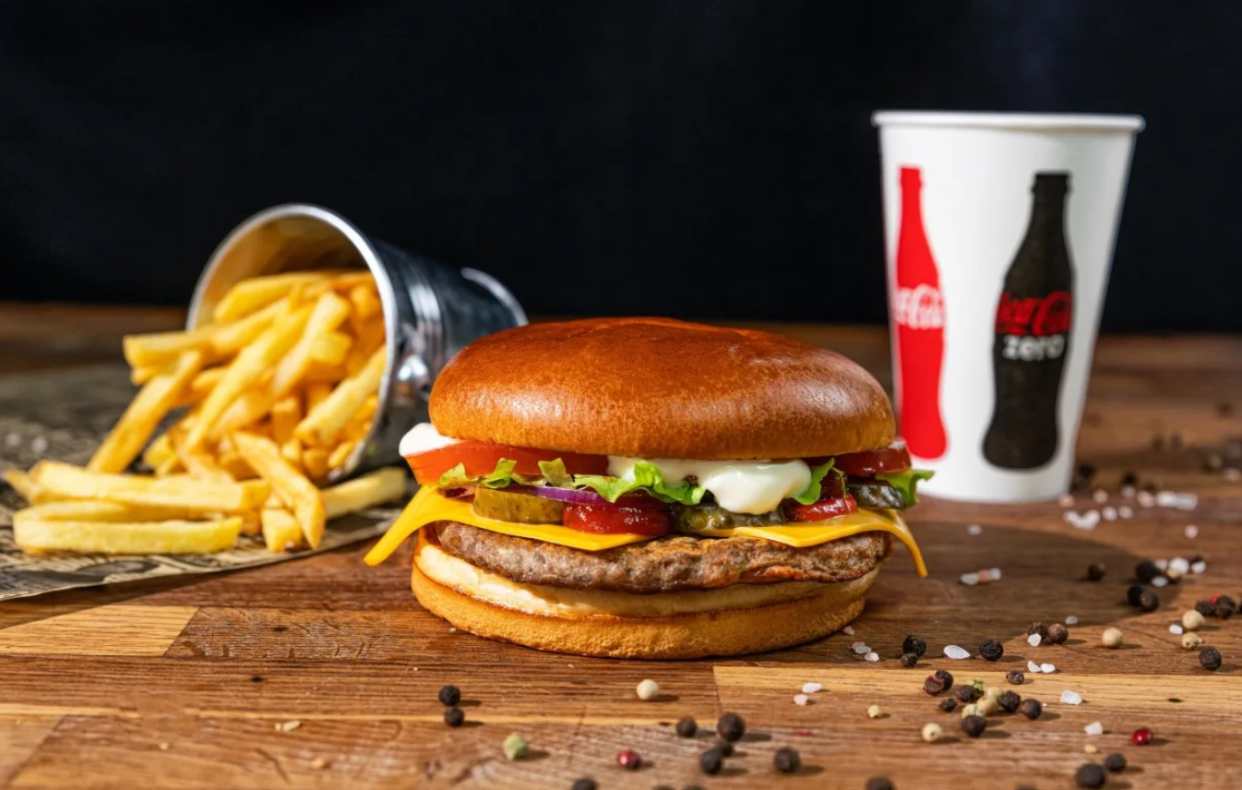 Dublu Chees (2 felii de carne de vită preparată pe grătar, 2 felii debrânză cheddar, muștar, ketchup, ceapă, castraveți murați si chiflă - 165 gr.), cartofi prajiti (110/130 gr.), răcoritoare (330/500 ml.)