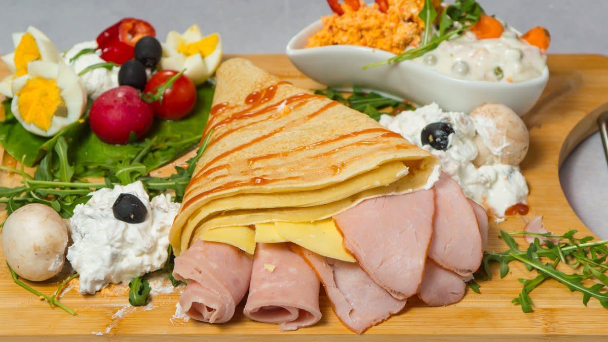 Palačinka sa šunkom, kačkavaljem i salatom od pečuraka