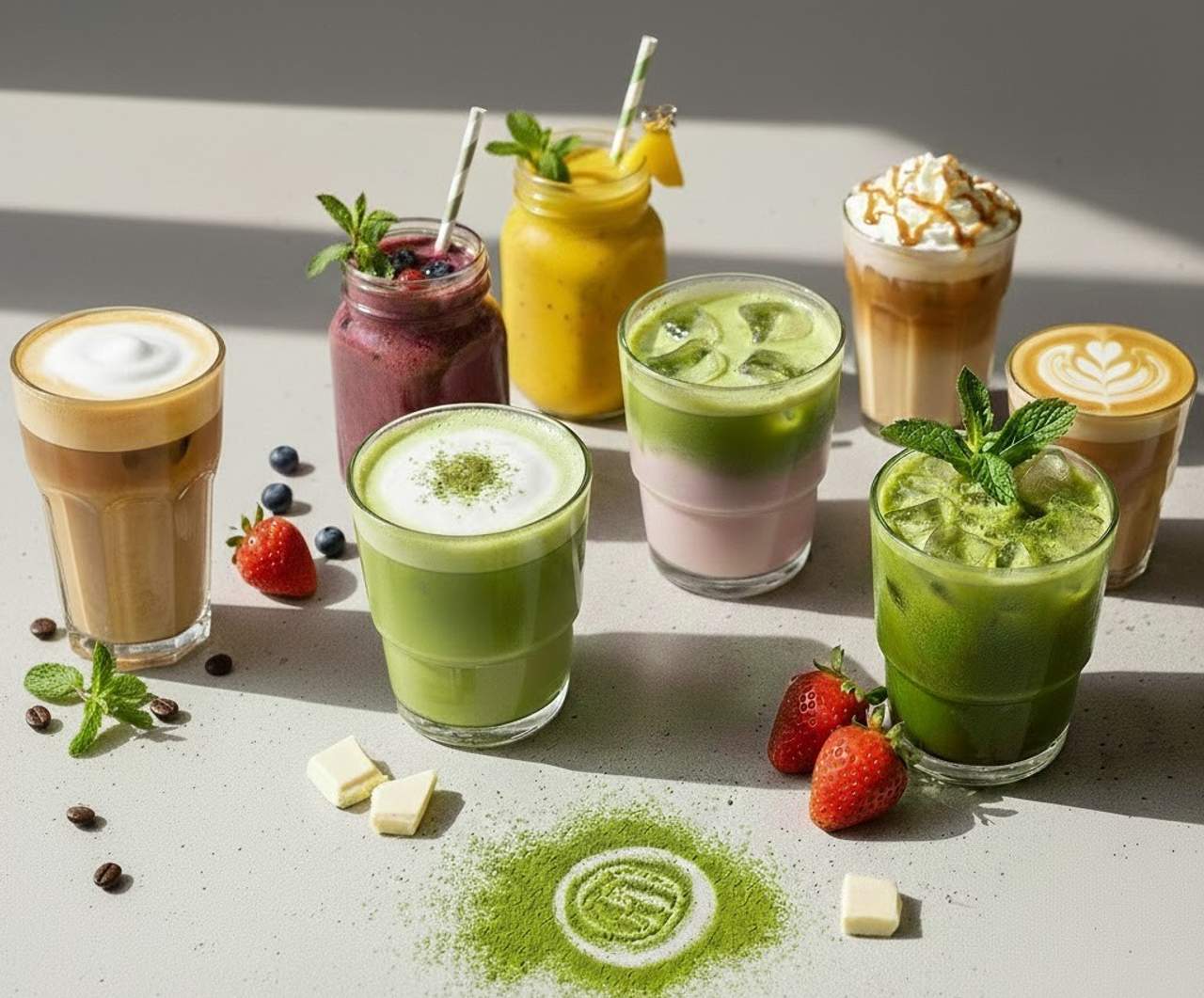Organska Matcha sa hladnim mlekom u kombinaciji sa ledom i ukusom jagode ili drugog voća po izboru
