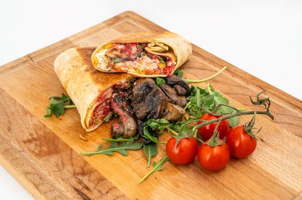 Pažljivo pripreman omlet/kajgana, od svežih namirnica u pšeničnoj tortilji. Tortilja, kajgana, humus, grilovane pečurke, paradajz, rukola.