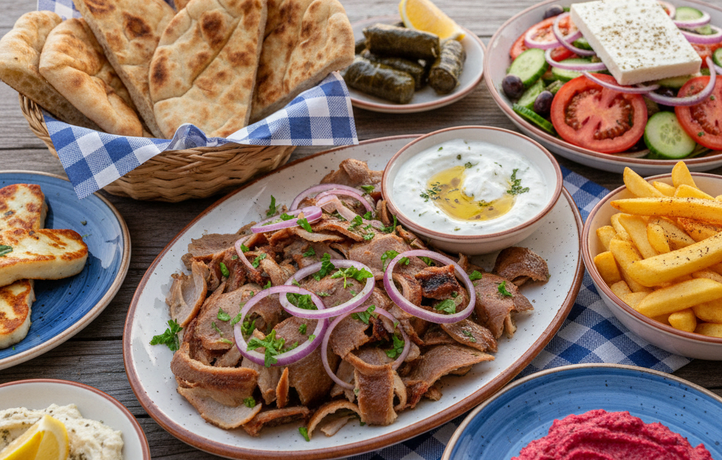 tradicionalan svinjski gyros mariniran na grcki nacin , sa tzatzikijem , povrcem i prilogom po izboru