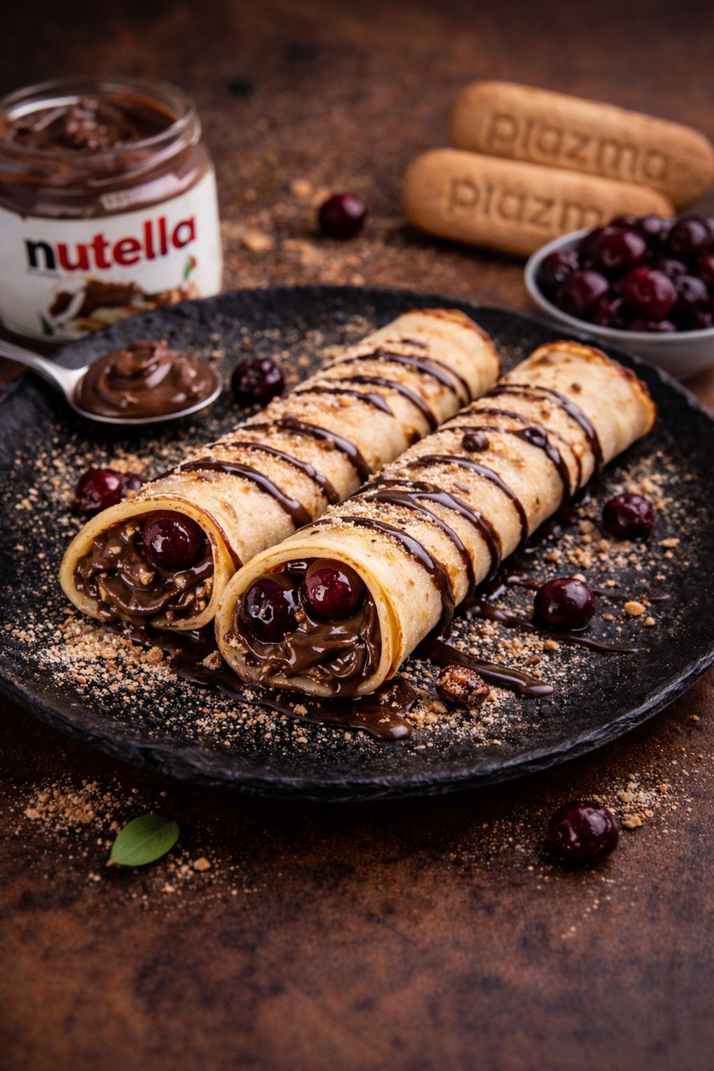 Domaće testo, pečene na tiganju, 2 komada, Nutella, plazma, višnja, palačinka Alergeni: laktoza, gluten, jaja, koštunjavo voće