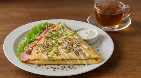 Млинець, змащений вершковим маслом, соковита шинка, сир, томат, соус Цезар, соус Тартар, соус Поблано, томати, сезонні овочі та зелень