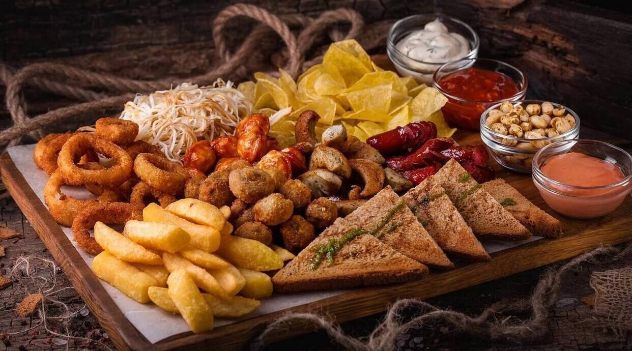 грибочки фрі, цибуляні кільця, фірмові ковбаски гриль, равіольки, картопля фрі, сир плетінка, смажений хліб на грилі, чіпси власного приготування, горішки, три види соусу