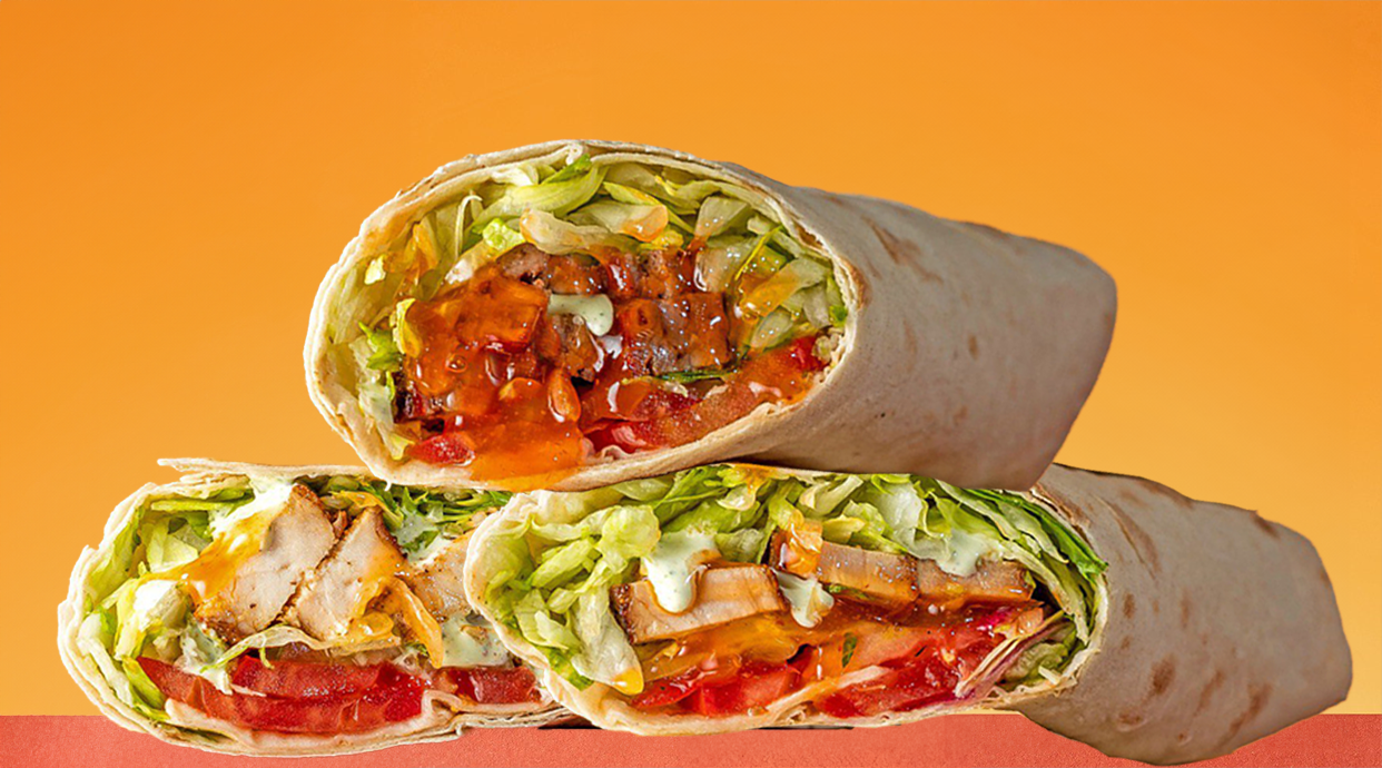 Хрумкий лаваш, салат айсберг, фірмовий соус, свіжі томати, мариновані огірки, червоний соус, гострий соус Шрирача, перець Халапеьйо та запечене м'ясо на вугіллі