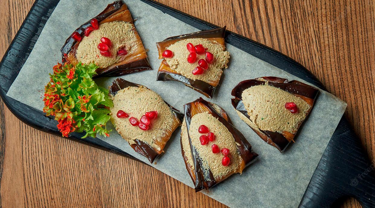 Баклажани по-грузинськи, пхалі з буряка та шпинату, запечені перці, фаршировані крем-чізом з часником та кропом, гострий перець цицак.*Страву формуємо за вагою. Кількість рулетиків може змінюватися в залежності від розміру овочів.