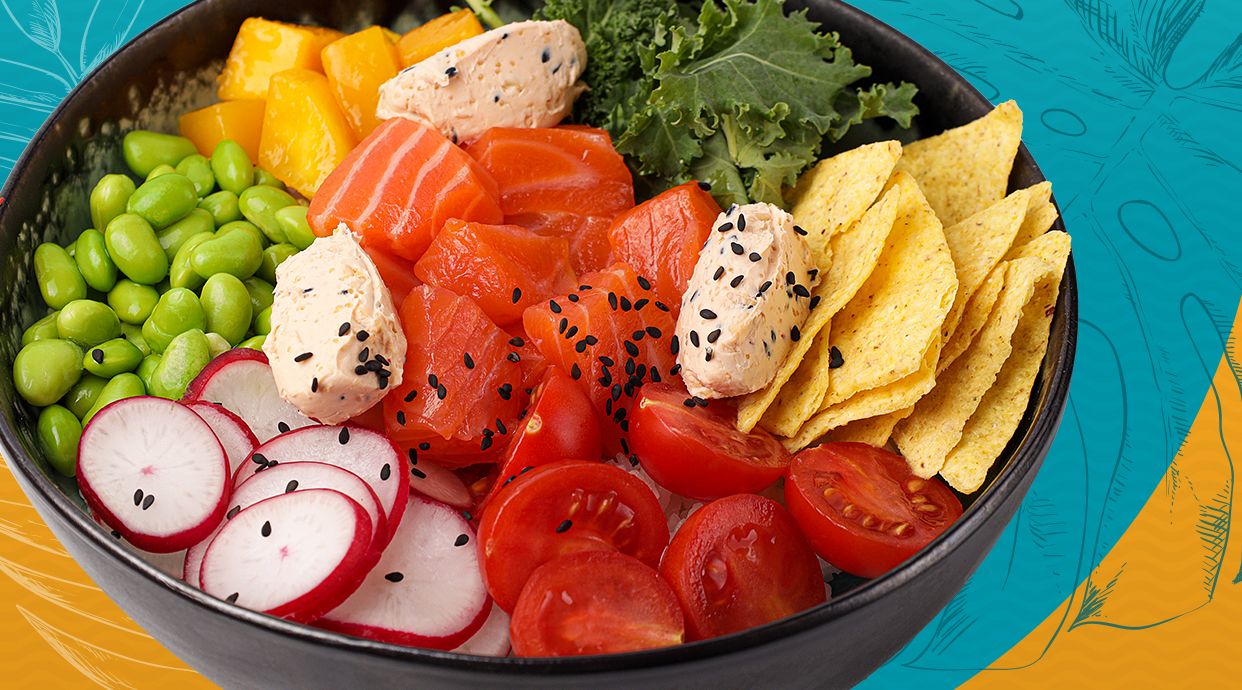 Поке зі свіжим лососем, манго, вершковим сиром, едамаме, помідорами чері, редискою, листям кейл, чорним кунжутом, чипсами Doritos та кунжутним соусом. *Містить алергени: продукти з риби, молоковмісні продукти, кунжут, горіхи, соєві боби, соя
