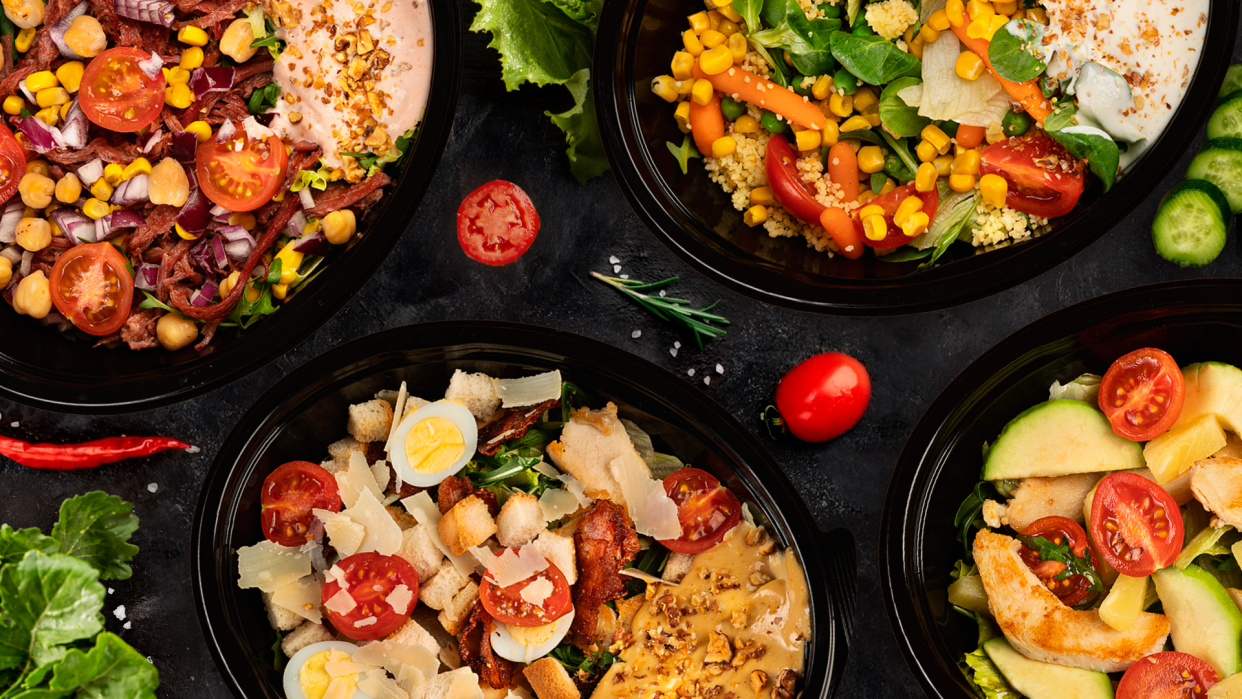 Куряче філе, цибуля фіолетова, томати Чері, мікс салат, рукола, Айсберг, консервована кукурудза, кіноа, мигдалеві пластівці, крем-сир з томатом та базиліком, пророщений маш, соус BBQ + фокачча та фреш яблучний 200мл