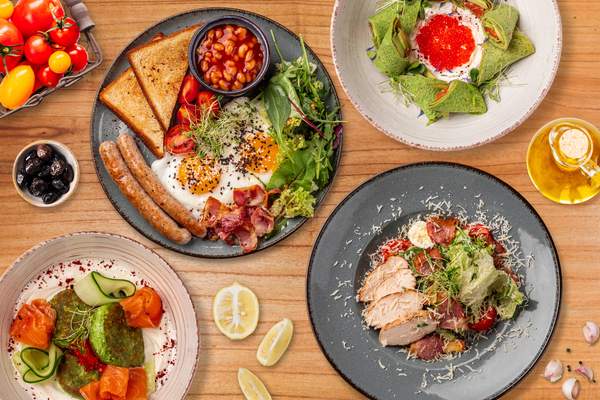Грильований бріош, два яйця та обсмажені печериці. Мюнхенські ковбаски, бекон і томатна квасоля створюють насичену, збалансовану подачу. Поряд — мікс салату з чері та легким медово-гірчичним соусом.