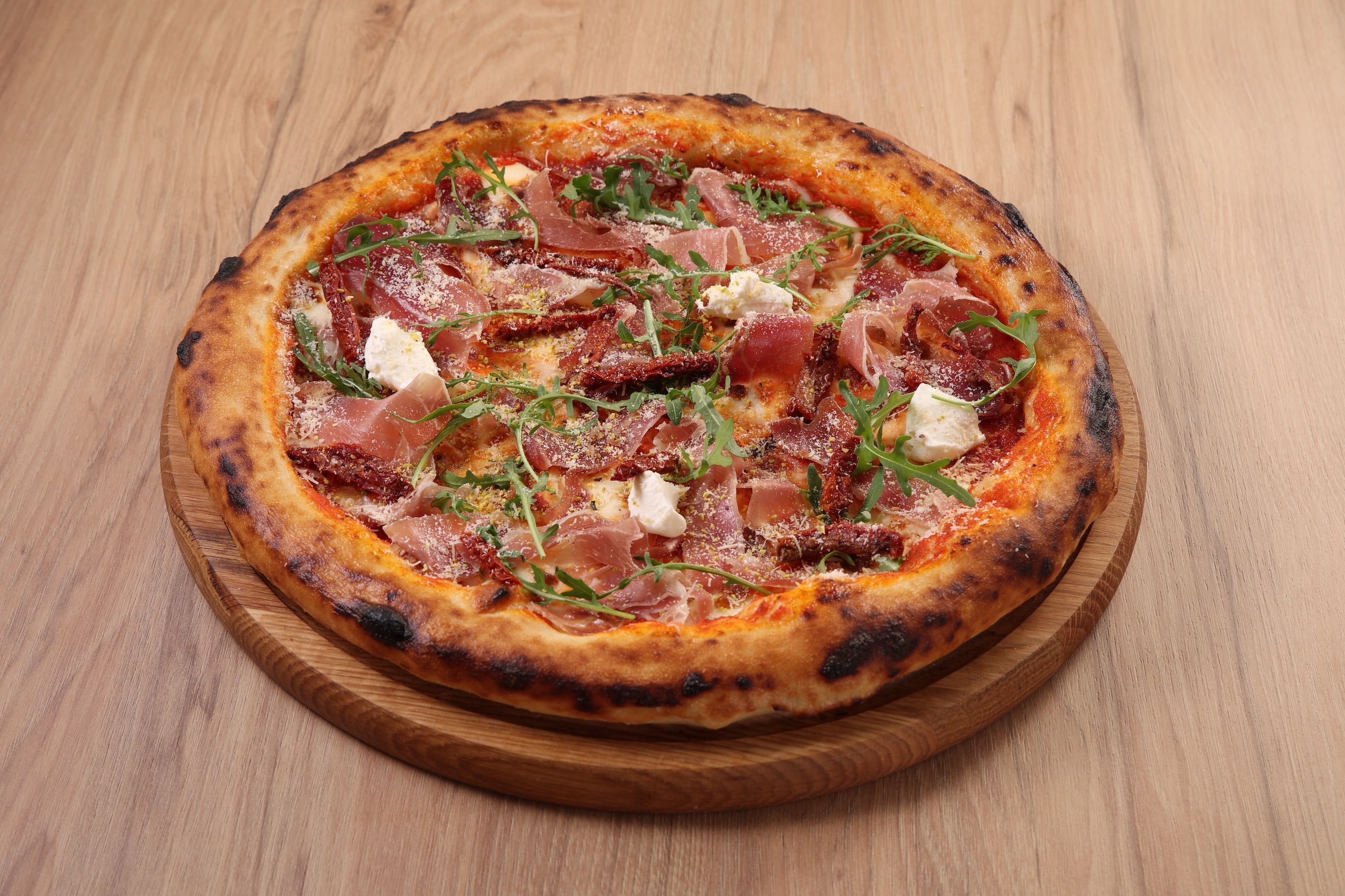 ферментоване тісто, вершковий соус, прошутто крудо, моцарела, в'ялені томати, крем-сир Hochland, грана падано, рукола, фісташка подрібнена.