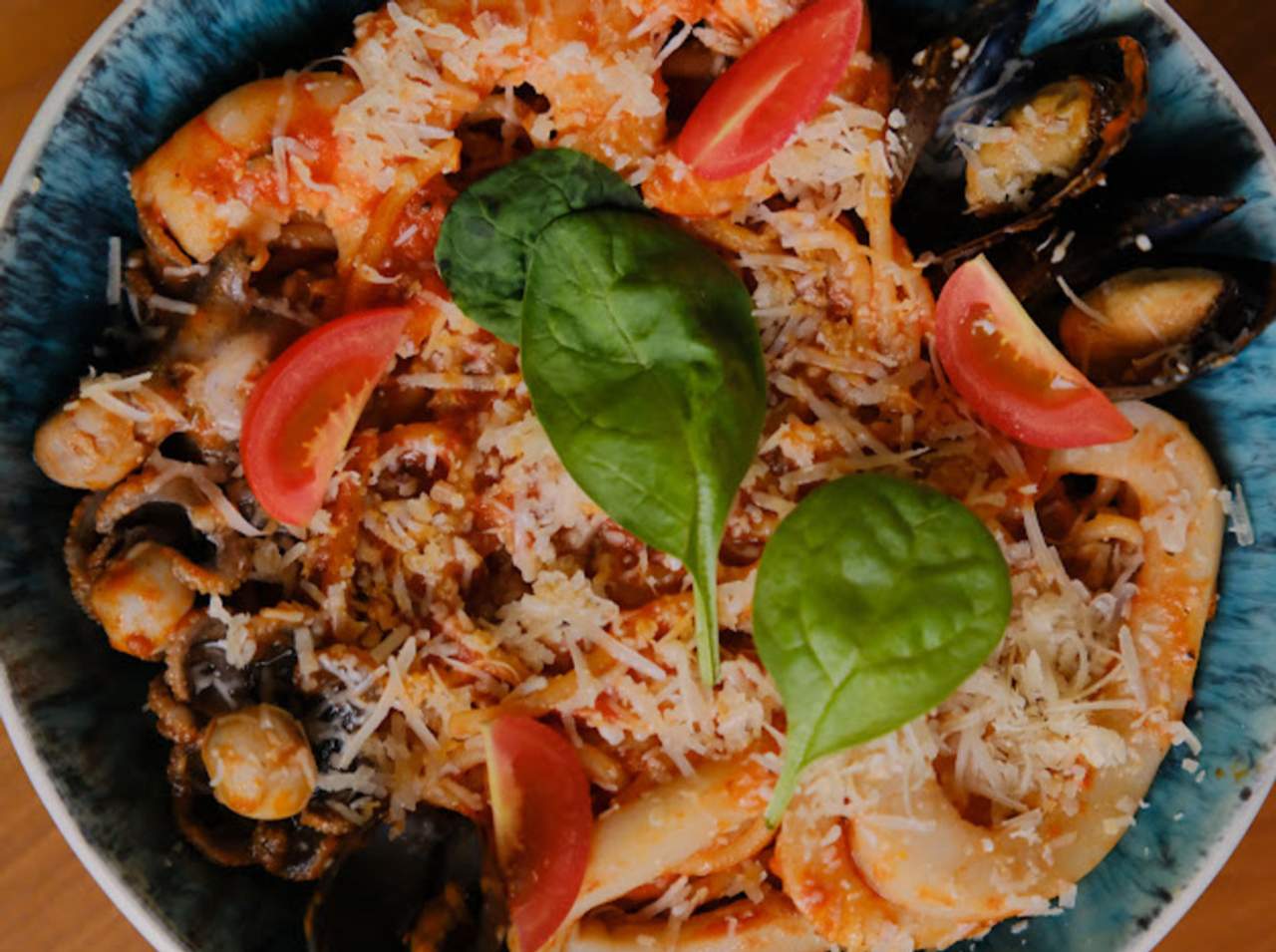 Креветки, мідії в мушлях, кальмар,восьминіг, чері, шпинат, соєвий соус, пармезан,пелатті(томатна основа)