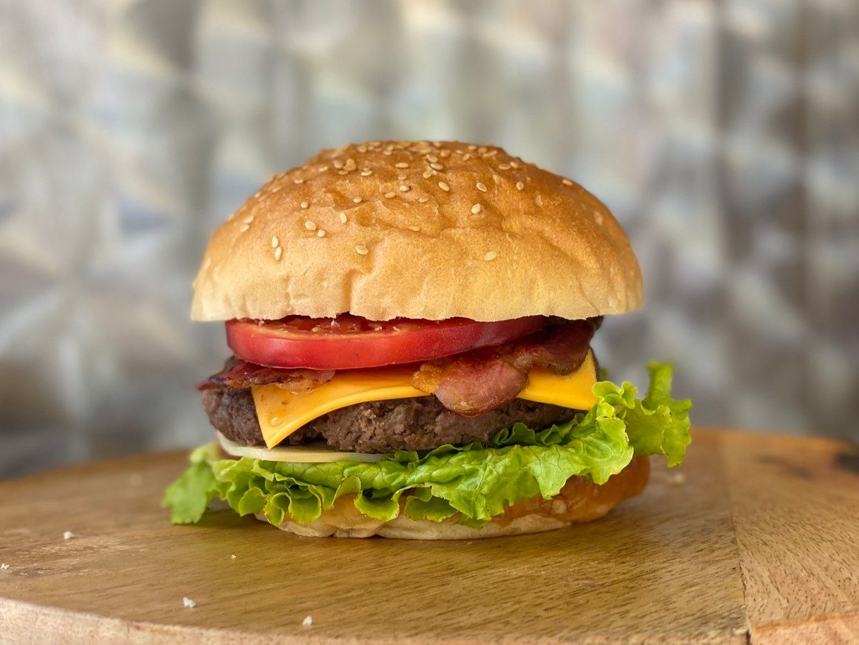 100% black angus телешко месо, хрупкав бекон, сирене гауда, пресен домат, свежа салата айсберг, карамелизиран лук, кетчуп Heinz, мaйонеза Hellmanns