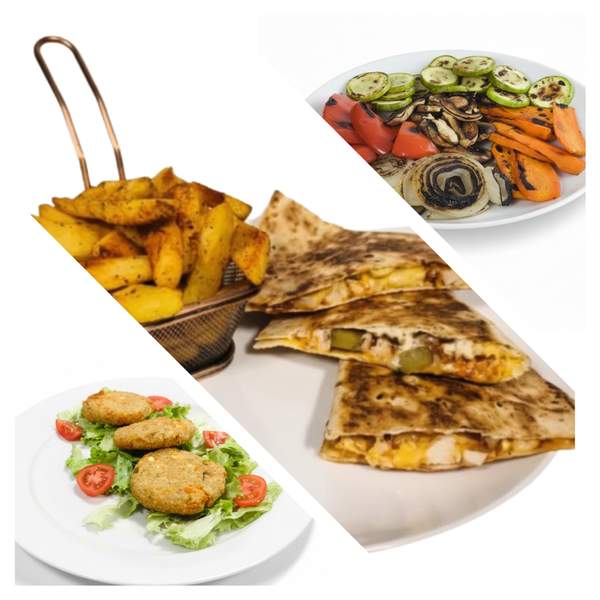 Питка, пилешко филе, кашкавал, майонеза, краставица, чедър, домат, зелена салата, ВВО сос и пържени картофи - 700г