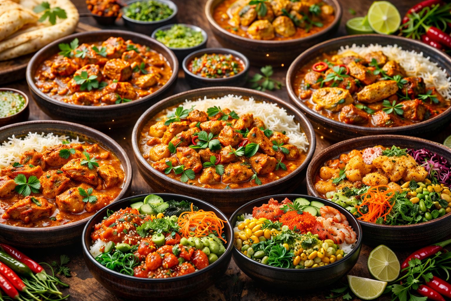 Пикантно наситено червено къри с кокосово мляко, картофи и свежи зеленчуци- млад зелен фасул, червена и зелена чушка, сервирано върху канапе от басмати ориз