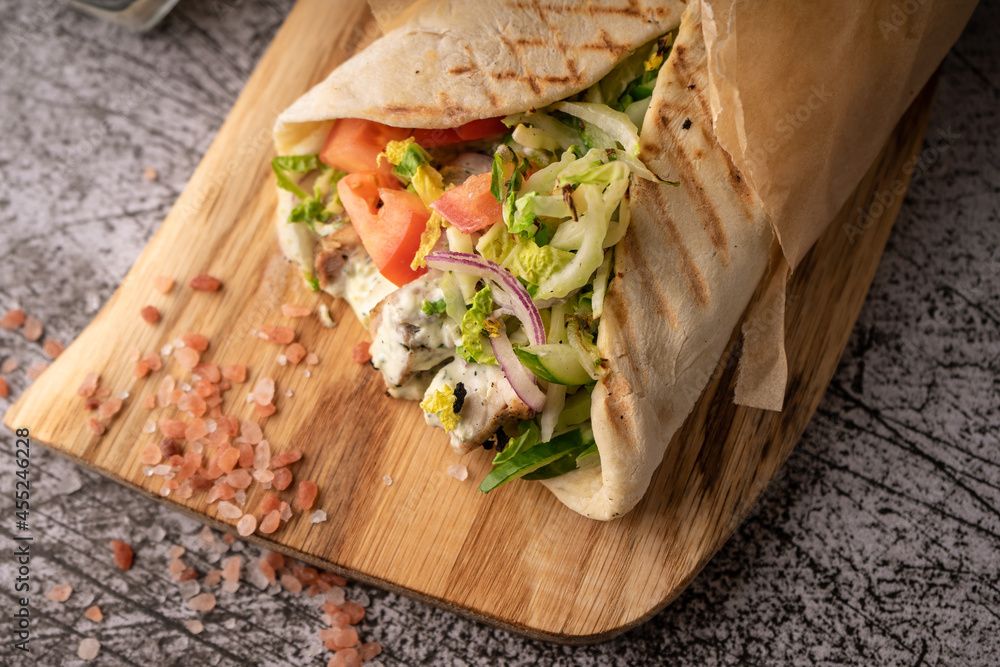 Арабска питка, пилешки бонфиле и пржени картофи и салата и сос .