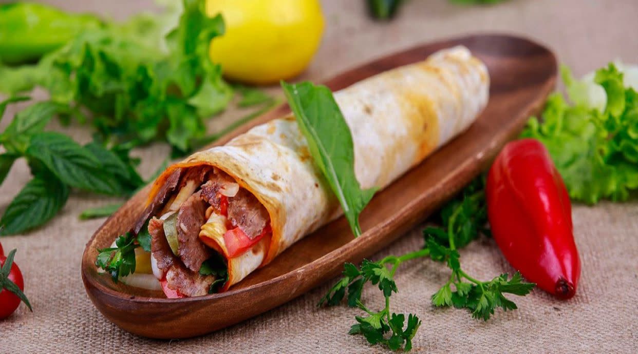 Пилешко месо,домати,краставици,зеле, зелена салата, печен лук, пържени картофи,кисели кратавички чеснов сос, люто,сос самурай.