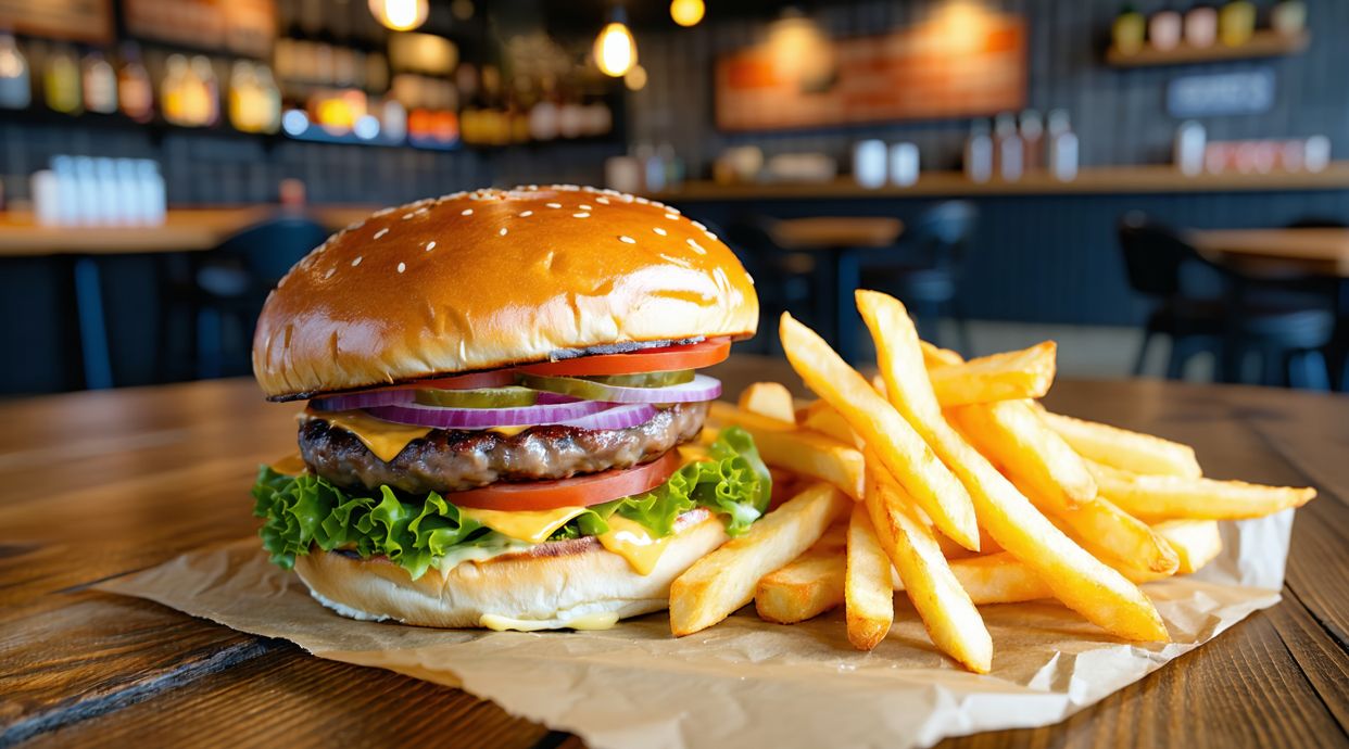 Pan, carne, bacon, huevo, queso, lechuga, tomate y cebolla con patatas y bebida