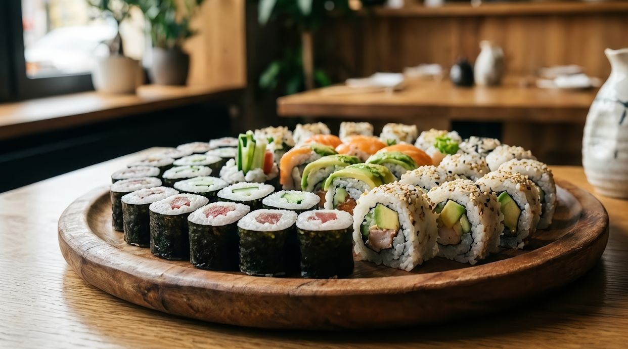 Cangrejo natural, aguacate y pepino, envuelto en salmón, atún, gambas, pez mantequilla, anguila, mango y aguacate