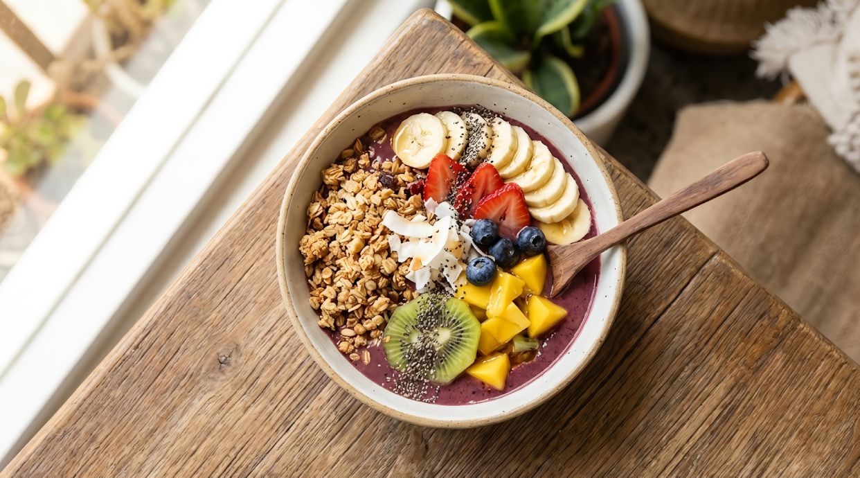 Fresa, plátano, chía, pudding, almendra crocante, granola, proteína vegetal y miel.