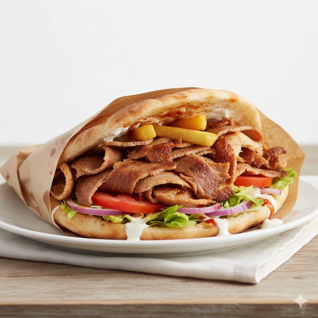 Kebab ternera, pollo o mixto, aros de cebolla (6 uds.), patatas, tarrina salsa de yogurt y bebida a elegir
