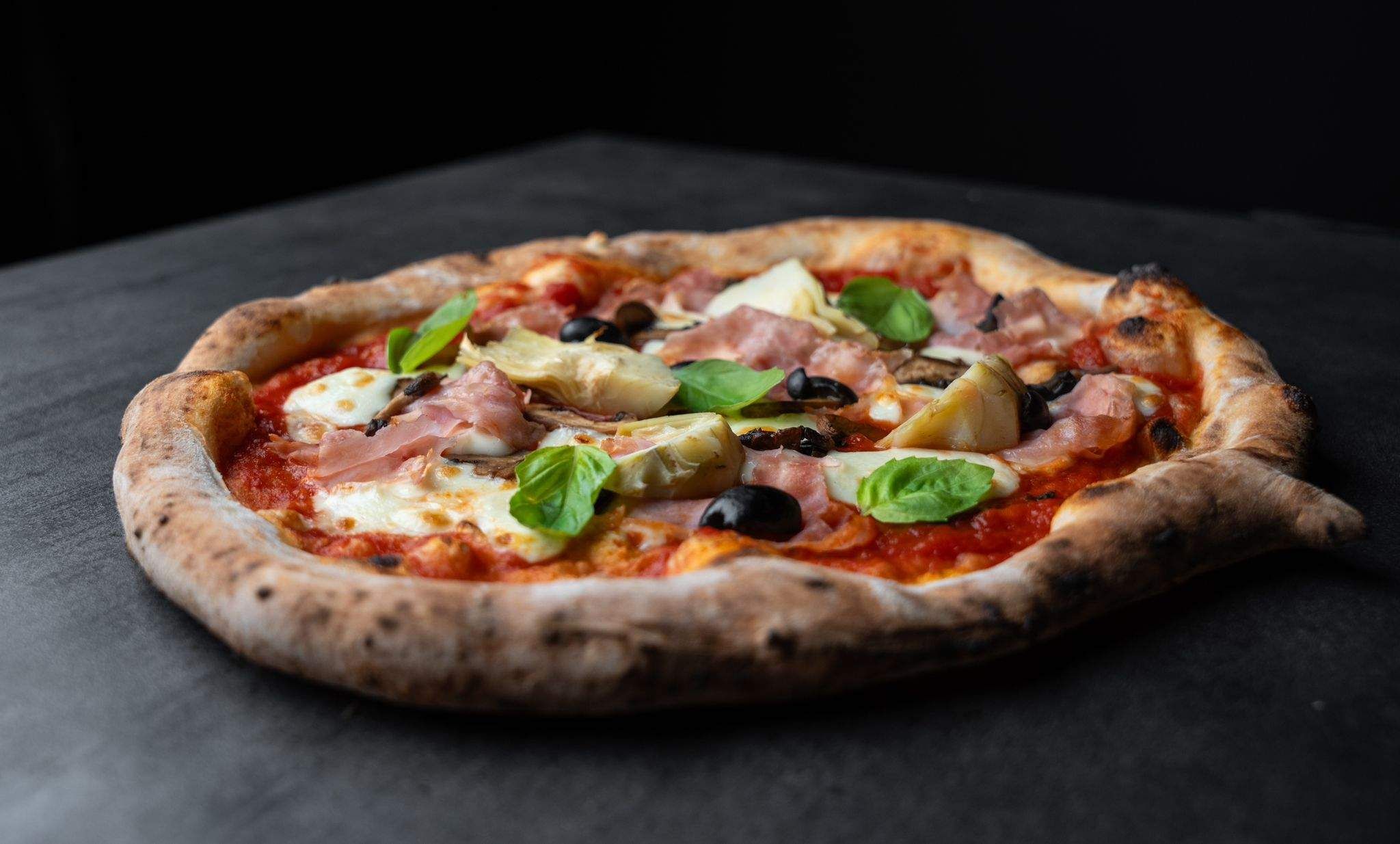 Pomodoro San Marzano D.O.P tomate, Fior Di Latte mozzarella, prosciutto cotto (jamón cocido), champiñones, spicchi di carciofi alcachofas, olive nere