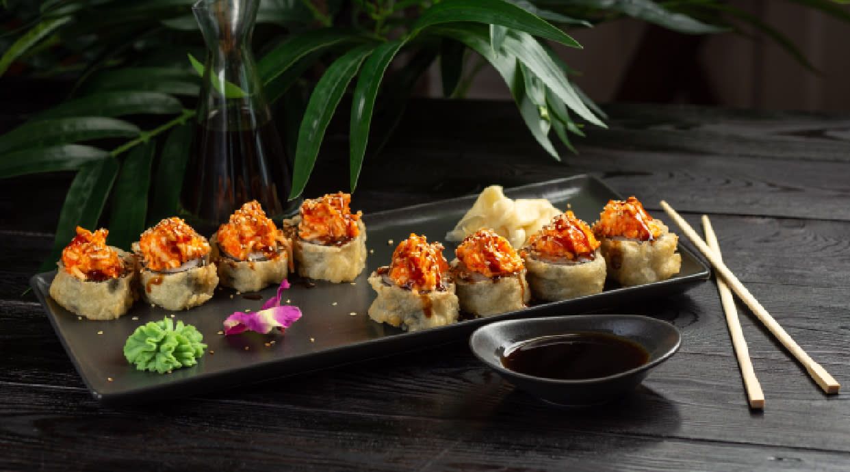 Roll relleno de pollo crujiente con queso crema, mango, salsa sweet chilli y cebolla crunch.