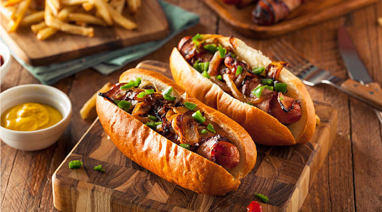 Mayonesa, tomate, salchichas, lomo, bacón, aceitunas, maíz, lechuga y queso