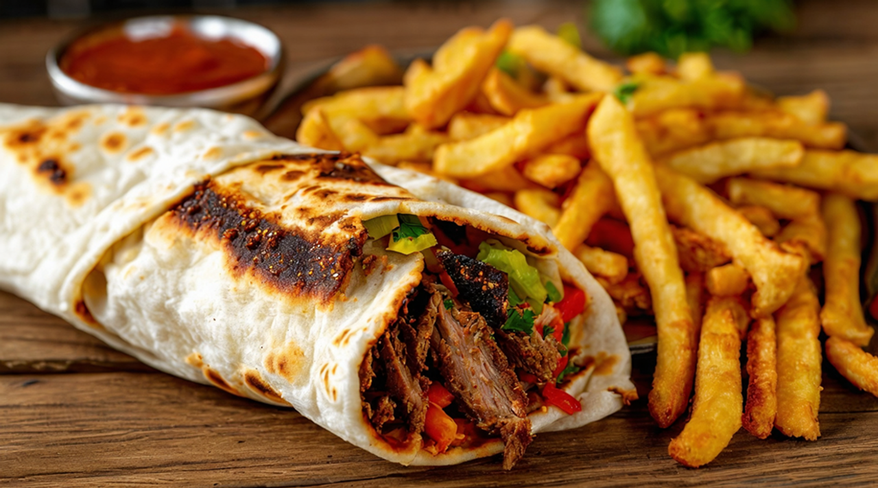 Ensalada, carne de pollo o ternera, salsa blanca, salsa roja y salsa picante