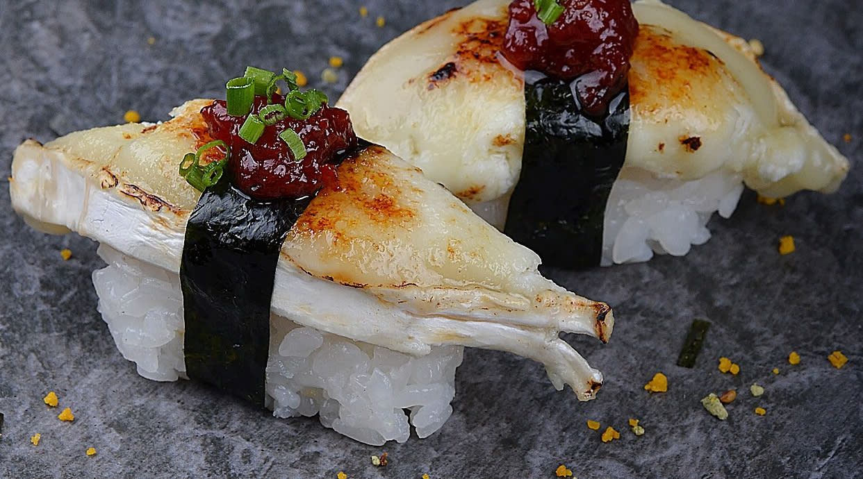 Hosomaki de mayor tamaño relleno de tartar de atún y salmón picante, canónigos, aguacate, queso de cabra, cebolla caramelizada, chutney de tomate y sésamo blanco. **Alérgenos: Gluten, pescado, lácteos, sésamo