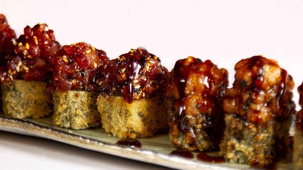 Rollito tempurizado, relleno de aguacate, recubierto de tartar picante de atún Balfegó, furitake y salsa teriyaki