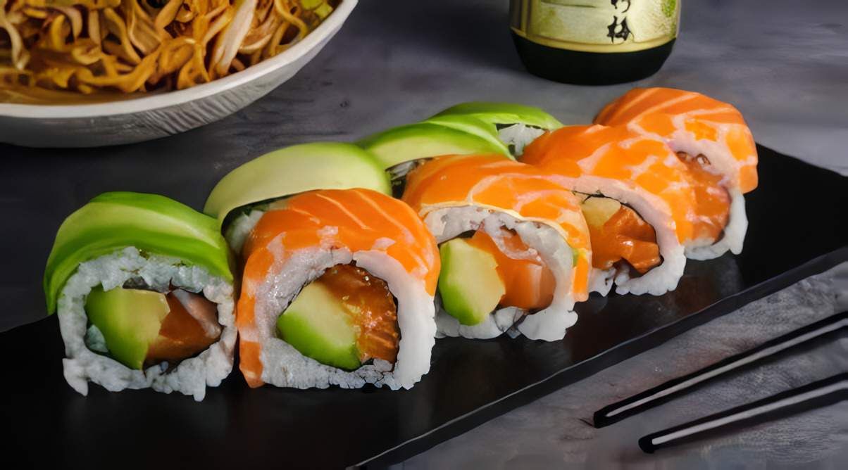 Roll de aguacate y queso Philadelphia con alga nori, suave y cremoso en cada bocado.