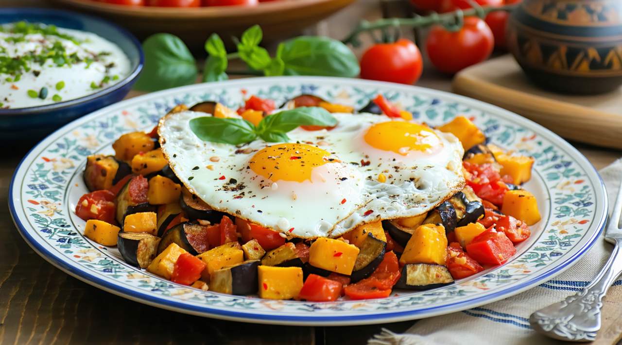 Mezcla deliciosa de vegetales fritos: pimientos, tomates y calabaza, acompañados de huevos y papas fritas