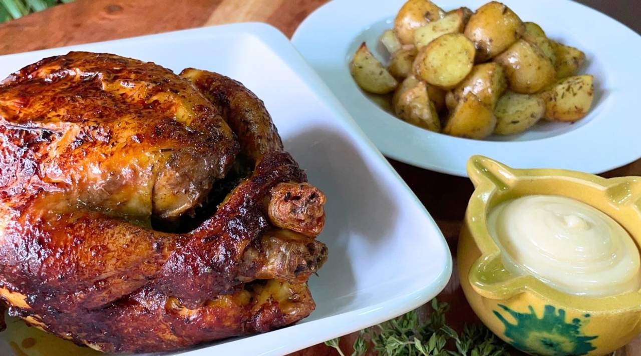 Pollo entero groc català, patatas y alioli