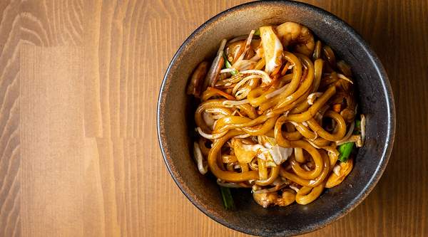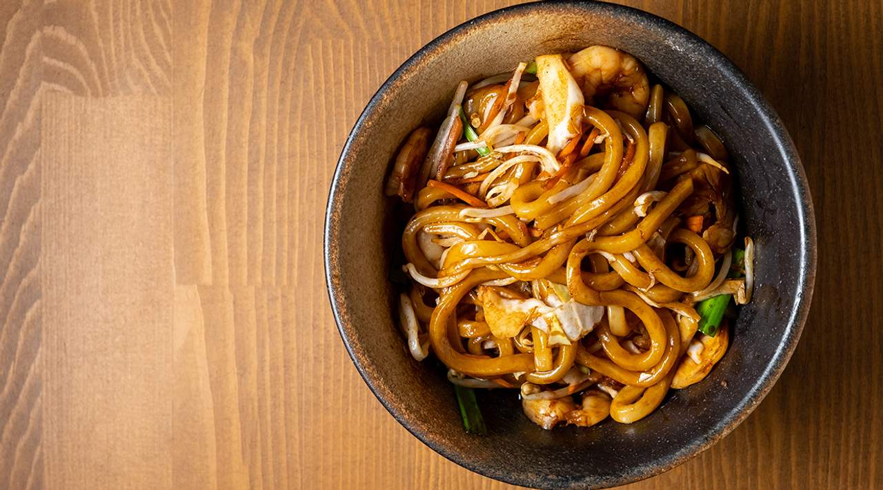 Fideos udon salteados con huevo, repollo, zanahoria y cebolla con salsa teriyaki
