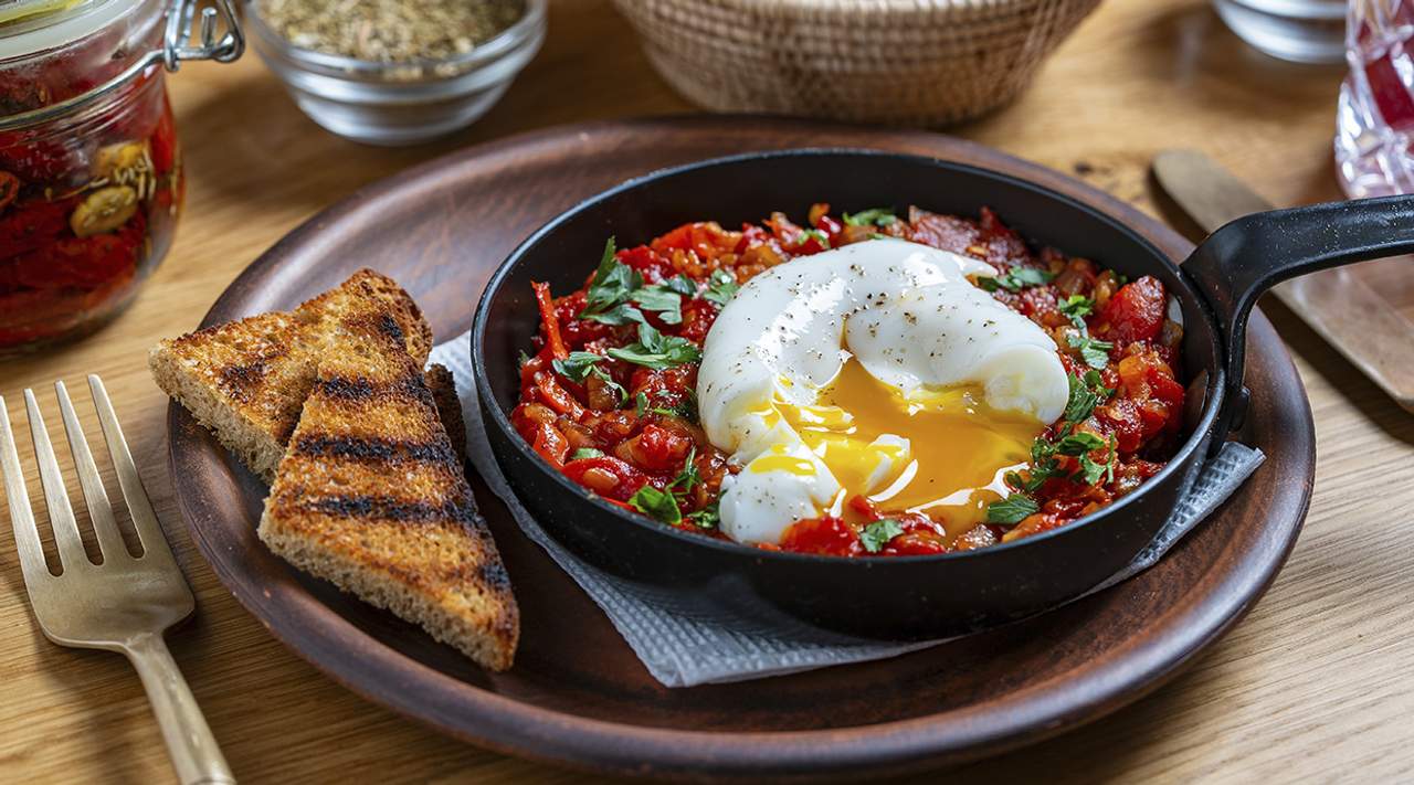 Dos huevos escalfados en sartén con tomate, pimiento y cebolla. Servidos con pan (1 ud.)
