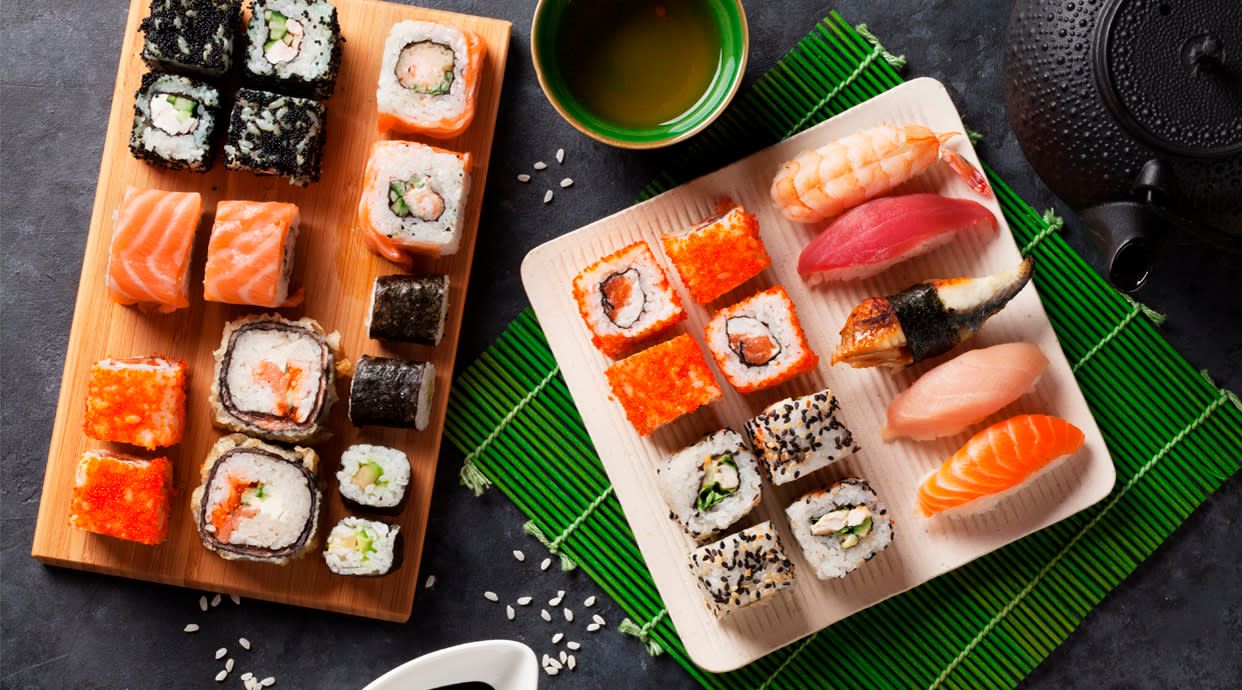 California salmón (8 uds.), maki atún (8 uds.), nigiri salmón (2 uds.), nigiri atún (2 uds.), sashimi salmón (3 uds.), sashimi atún (3 uds.)