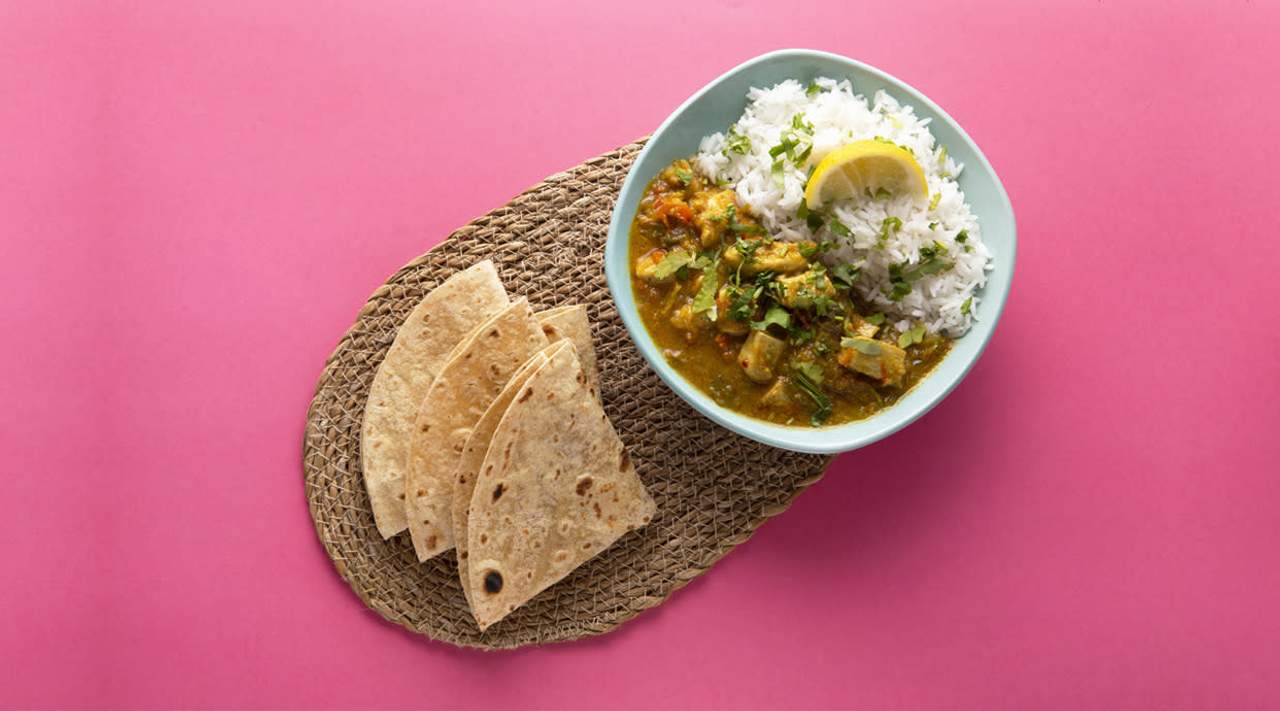 Pollo deshuesado, picante, condimentos indios masala con especiales tradicionales