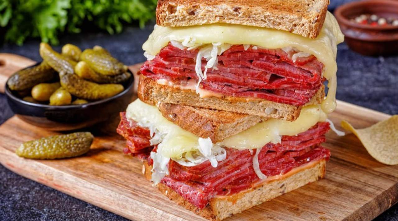 pastrami, rúcula, queso, tomate, pepino encurtido, salsa horseradish acompañado de patatas rústicas al horno